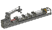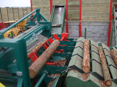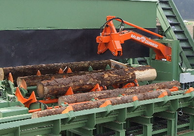 Příčný dopravník se 4 podávacími řetězy pro příčný transport kmenů přes reduktor, rychlost posuvu 60 m/min, pohon pomocí motoru 3 kW s plochou převodovkou.